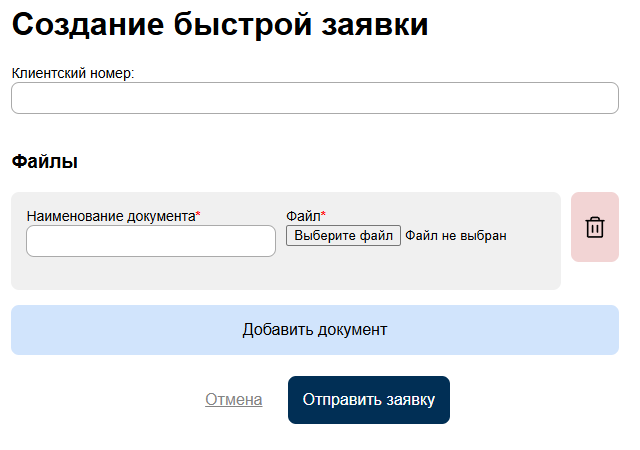 Страница с формой добавления быстрой заявки доступна по ссылке "Быстрая заявка" в верхнем меню сайта. Для удобства, в Ленте заявок присутствует кнопка с аналогичным названием и функционалом.